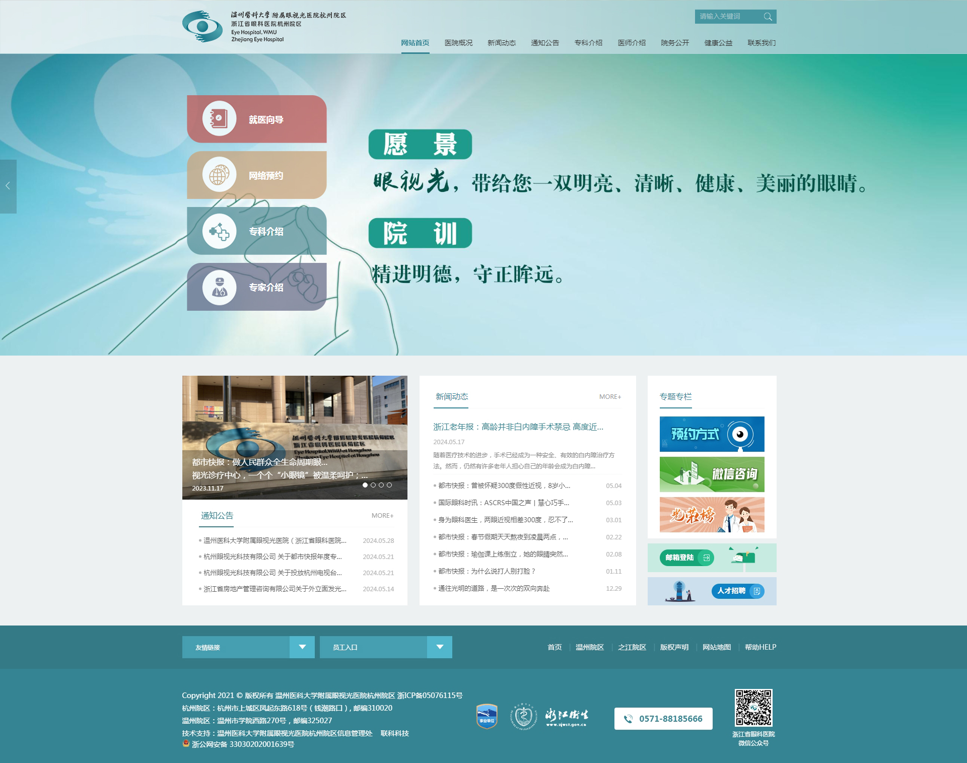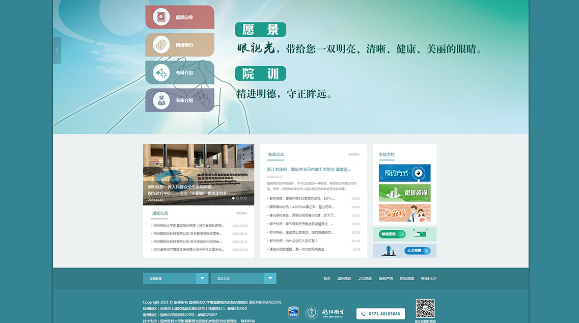 溫州醫(yī)科大學(xué)附屬眼視光醫(yī)院成立于1998年,2009年經(jīng)省衛(wèi)生廳批準(zhǔn)增掛“浙江省眼科醫(yī)院”,2010年開設(shè)杭州院區(qū),是浙江省首家三級(jí)甲等眼科專科醫(yī)院。醫(yī)院承擔(dān)臨床醫(yī)療、醫(yī)學(xué)教育、醫(yī)學(xué)科研、預(yù)防保健等任務(wù),是國(guó)家眼部疾病臨床醫(yī)學(xué)研究中心、眼視光學(xué)和視覺科學(xué)國(guó)家重點(diǎn)實(shí)驗(yàn)室、國(guó)家眼視光工程技術(shù)研究中心、國(guó)家藥監(jiān)局眼科疾病醫(yī)療器械和藥物臨床研究與評(píng)價(jià)重點(diǎn)實(shí)驗(yàn)室,以及國(guó)家眼科學(xué)臨床重點(diǎn)??啤⒔逃拷暦揽嘏c診治工程研究中心。