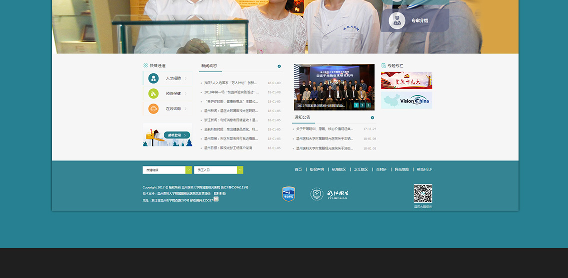溫州醫(yī)科大學附屬眼視光醫(yī)院成立于1998年,2009年經省衛(wèi)生廳批準增掛“浙江省眼科醫(yī)院”,設有溫州總院、杭州院區(qū)、之江院區(qū)等三個院區(qū),是目前浙江省唯一一家三級甲等眼科專科醫(yī)院。經過近二十年的發(fā)展,醫(yī)院形成了集醫(yī)療、教學、科研、產業(yè)、公益、推廣為一體的眼視光體系。 【醫(yī)療服務】醫(yī)院是國家臨床重點??平ㄔO單位。2016年醫(yī)院門診量近70萬人次,開展手術4.85萬例,病人來自全國各地,其中溫州市外就診人次占比達到60.7%。醫(yī)院??讫R全,目前共設19個