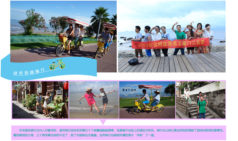 2013年6月22日,為了給員工創(chuàng)造一個(gè)放松機(jī)會(huì),我公司后勤部全體工作人員和部分技術(shù)部工作人員前往世界聞名的"海上花園"城市廈門體驗(yàn)夏季休閑之旅。本次旅游活動(dòng)主要有以下幾個(gè)環(huán)節(jié),它們分別是品嘗廈門特色小吃,繞環(huán)島路騎行,體驗(yàn)海風(fēng)及海水的清涼,乘坐輪渡享受海風(fēng),欣賞鼓浪嶼的百國(guó)建筑群,品味廈門休閑生活的節(jié)奏。22日中午,我們抵達(dá)廈門,按照原本的計(jì)劃逐一體驗(yàn)。