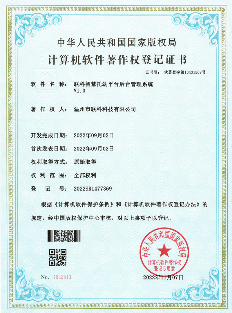 《聯(lián)科智慧托幼平臺后臺管理系統(tǒng)V1.0》于2022年11月07日被正式授予《中華人民共和國國家版權(quán)局計(jì)算機(jī)軟件著作權(quán)登記證書》,登記號為2020SR1477369。