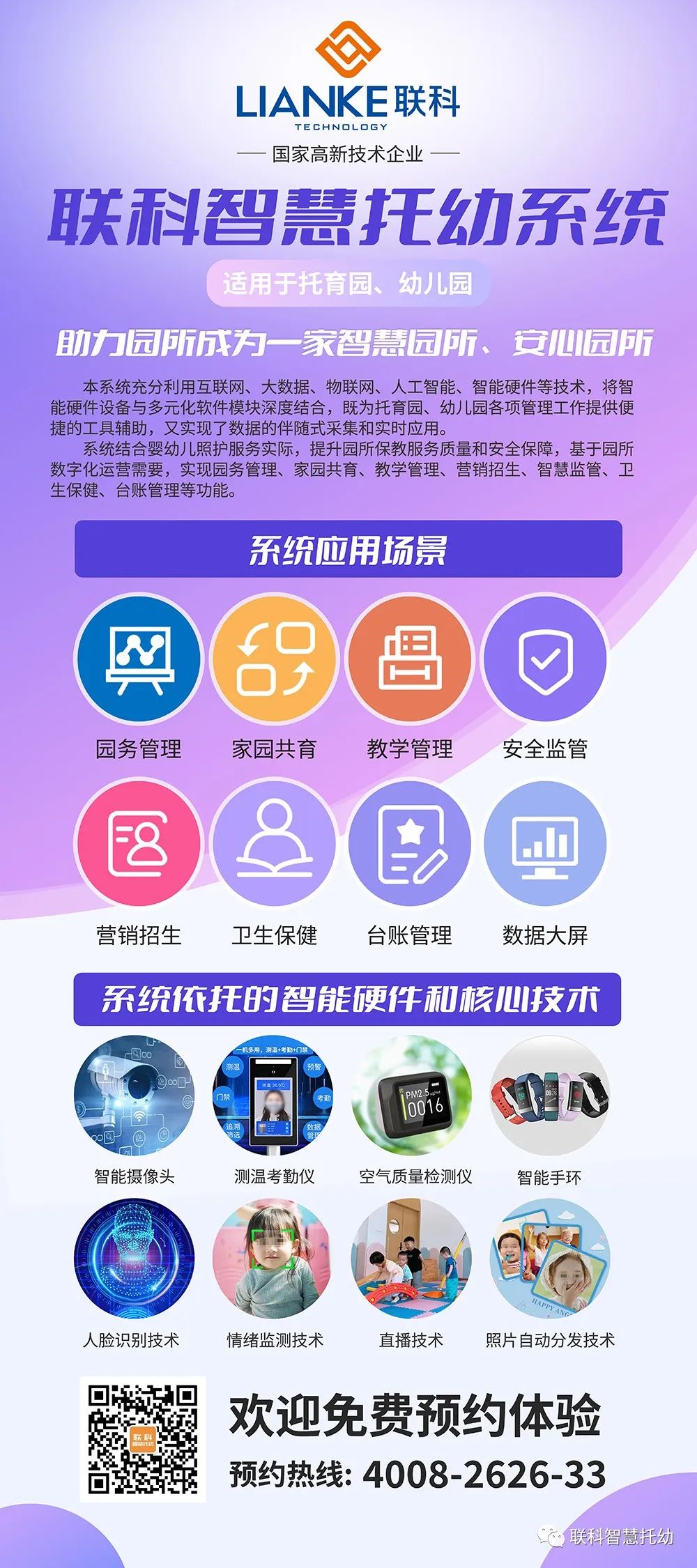 《聯(lián)科智慧托幼系統(tǒng)》充分利用互聯(lián)網(wǎng)、大數(shù)據(jù)、物聯(lián)網(wǎng)、人工智能、智能硬件等技術(shù),將智能硬件設(shè)備與多元化軟件模塊深度結(jié)合,既為托育園、幼兒園各項(xiàng)管理工作提供便捷的工具輔助,又實(shí)現(xiàn)了數(shù)據(jù)的伴隨式采集和實(shí)時(shí)應(yīng)用。系統(tǒng)結(jié)合嬰幼兒照護(hù)服務(wù)實(shí)際,提升園所保教服務(wù)質(zhì)量和安全保障,基于園所數(shù)字化運(yùn)營需要,實(shí)現(xiàn)園務(wù)管理、家園共育、教學(xué)管理、營銷招生、智慧監(jiān)管、衛(wèi)生保健、臺賬管理等功能。