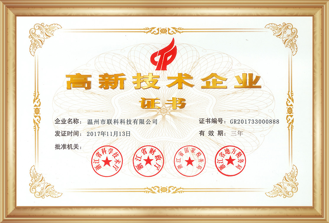 2017年12月15日,國家科技部火炬中心公布浙江省2017年第一批高新技術企業(yè)名單。溫州市聯(lián)科科技有限公司榜上有名,被正式認定為國家高新技術企業(yè),同時授予國家高新技術企業(yè)證書。