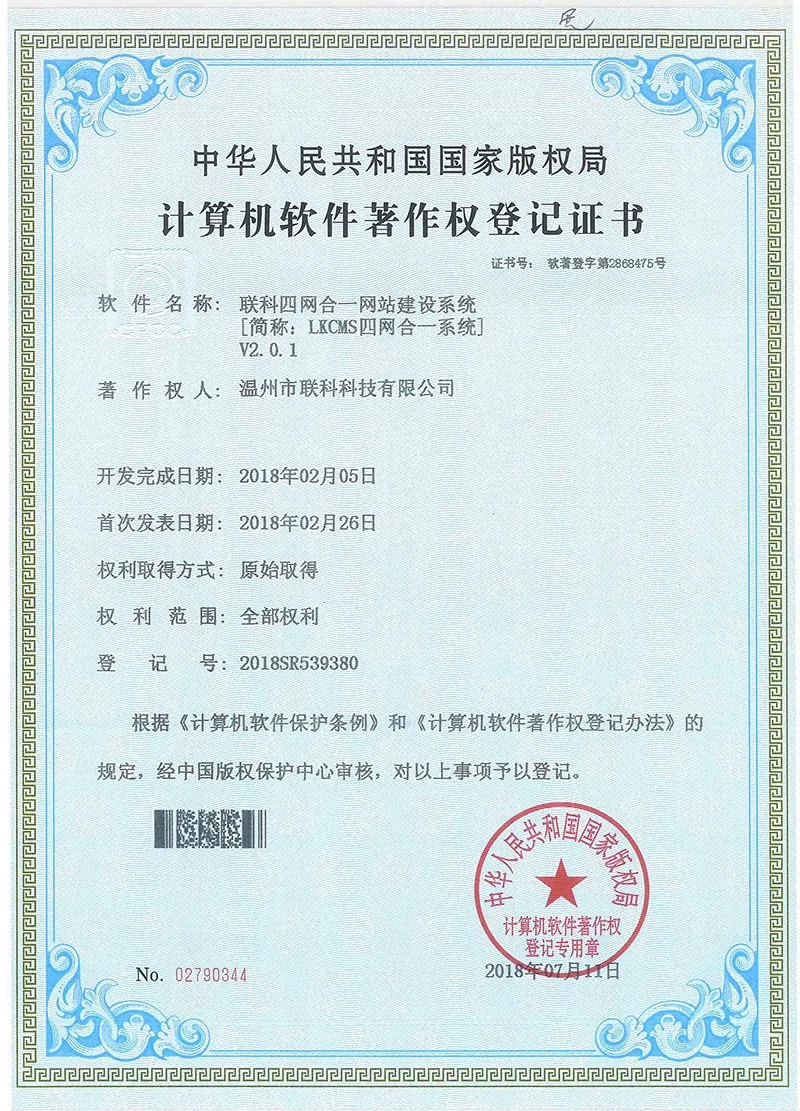 《聯(lián)科四網(wǎng)合一網(wǎng)站建設系統(tǒng)V2.0.1》于2018年07月11日被正式授予《中華人民共和國國家版權局計算機軟件著作權登記證書》,登記號為2018SR539380。