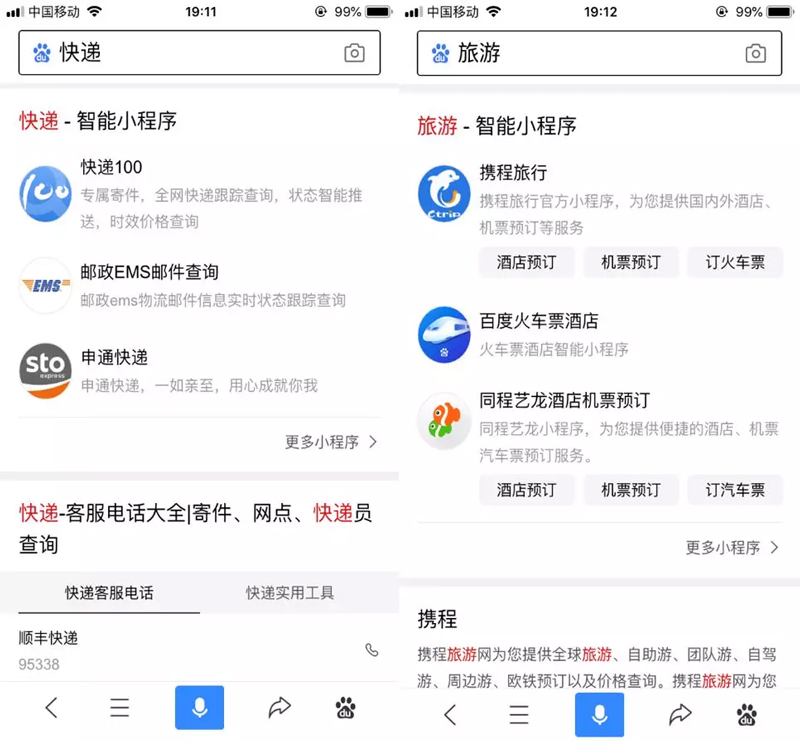 泛詞聚合卡片示例:當用戶搜索“快遞”時,搜索結(jié)果中會匹配出“快遞100、郵政EMS郵件查詢”等3個相關智能小程序。點擊下方的“更多小程序”,可以查看與“快遞”或“旅游“相關的全部智能小程序。