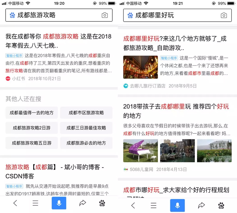 長尾詞搜索示例:用戶搜索“成都旅游攻略”“成都哪里好玩”等關鍵詞,小紅書和去哪兒旅行的相關內(nèi)容都會以智能小程序的方式出現(xiàn),并會通過醒目的“智能小程序”標記提醒用戶。