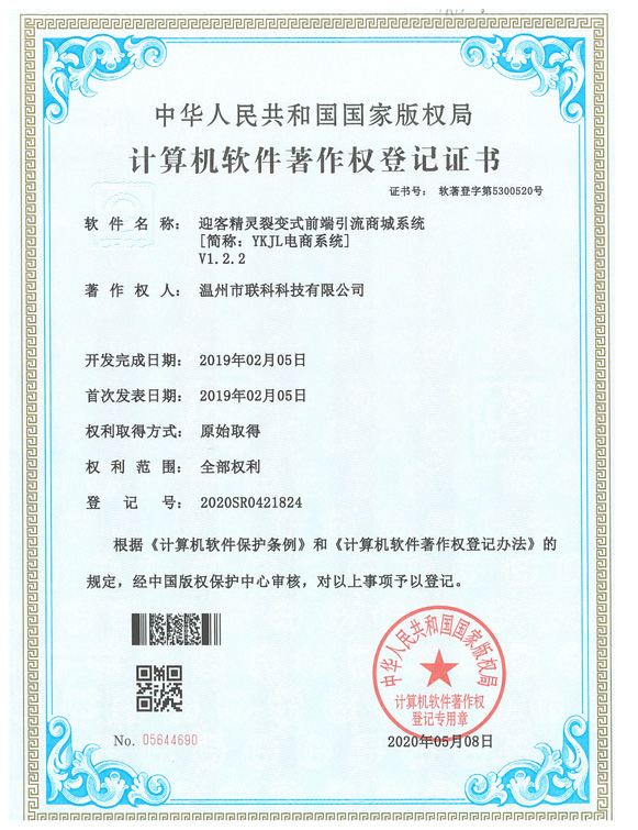 《迎客精靈裂變式前端引流商城系統(tǒng)V1.2.2》于2020年05月08日被正式授予《中華人民共和國國家版權(quán)局計(jì)算機(jī)軟件著作權(quán)登記證書》,登記號(hào)為2020SR0421824。