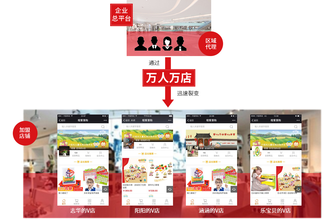 讓代理商、員工及親友、顧客在平臺(tái)上一起開(kāi)設(shè)該企業(yè)的線上連鎖加盟店。